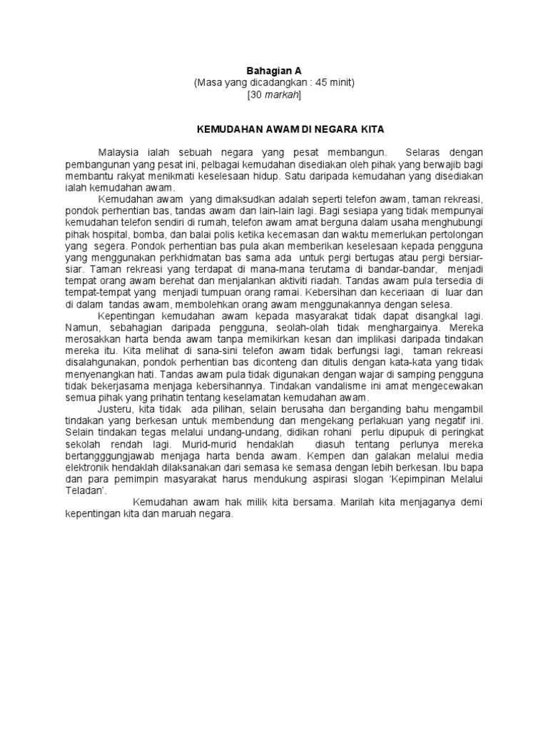 Contoh Karangan Bahasa Melayu BM PT3 Tingkatan 1 2 3. Berbagai-bagai kemudahan telah disediakan oleh pihak berkuasa dalam usahanya untuk meningkatkan taraf hidup rakyat di negara ini.